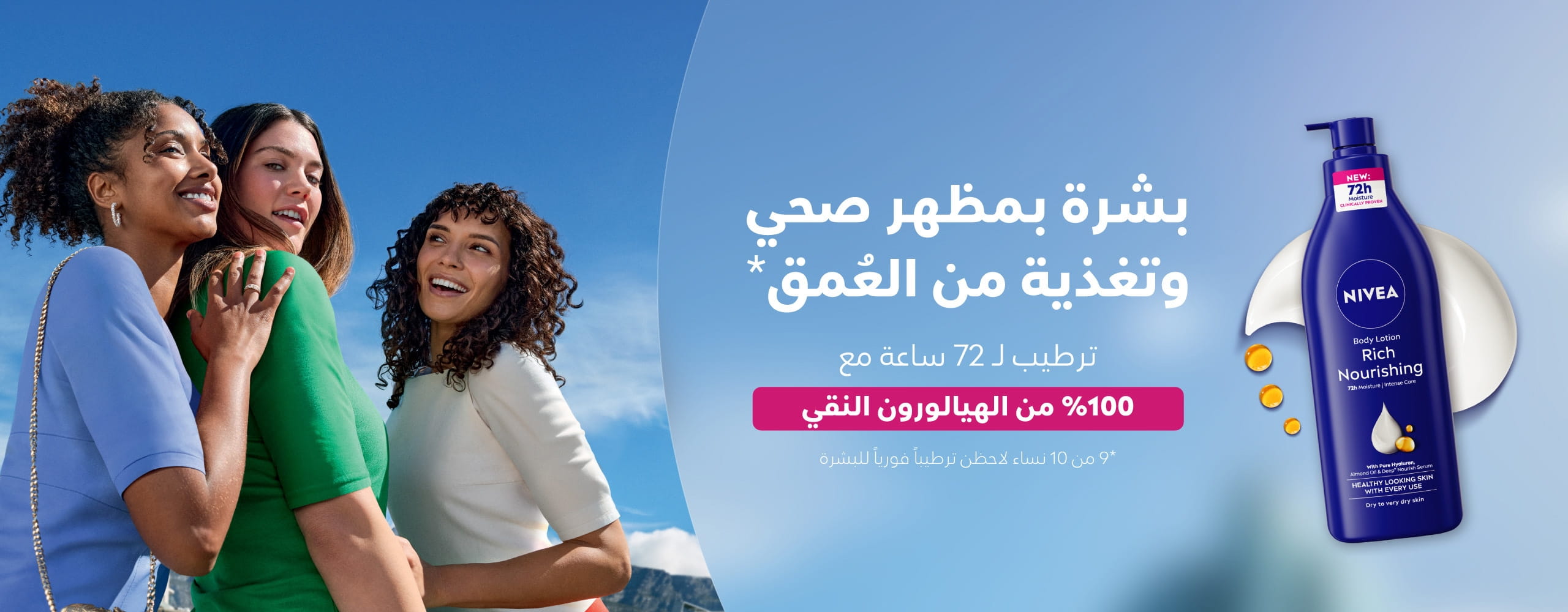 لوشن الجسم Rich Nourishing من نيڤيا، بتركيبته الجديدة الغنية بـ %100 من الهيالورون النقي وزيت اللوز الطبيعي وسيروم الترطيب العميق، يمنح بشرتك ترطيباً فائقاً وتغذية من العمق. يساعد الهيالورون النقي في تعزيز قدرة البشرة على امتصاص الرطوبة، لتنعمي بترطيب يدوم حتّى 72 ساعة. كمّلي روتين العناية ببشرتك مع لوشن الجسم من نيڤيا، وامنحيها التغذية التي تستحقها، لتتألقي ببشرة بمظهر صحي بعد كل استخدام.
