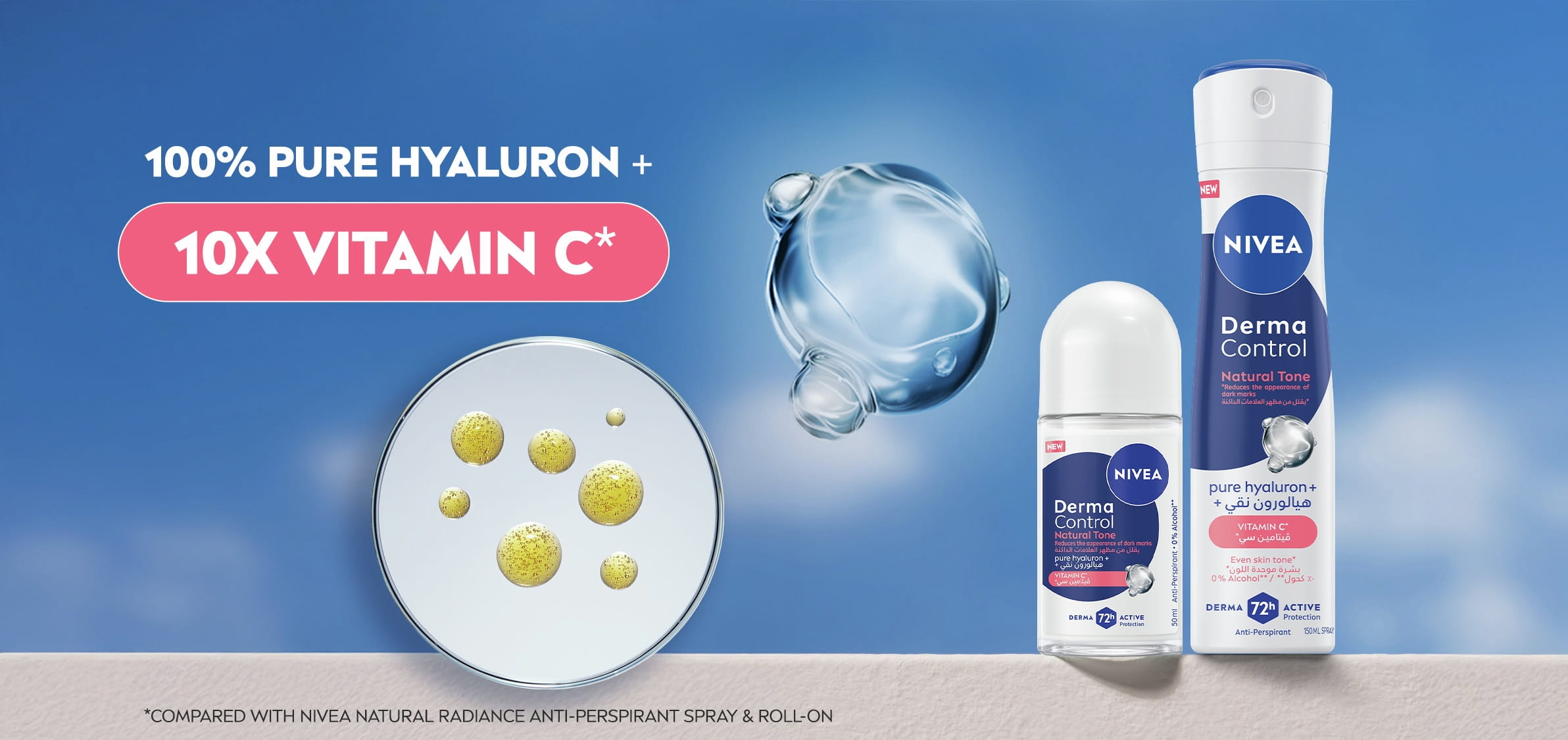 مجموعة Derma Control Natural Tone من نيڤيا، بتركيبة غنية بـ 100٪ من الهيالورون النقي و10 مرّات أكثر فيتامين *C، تخفّف العلامات الداكنة، وتمنحك إشراقة موحّدة اللون، وحماية من التعرّق والرائحة لمدّة 72 ساعة، لتنعمي ببشرة ناعمة ومظهر صحي تحت الإبطين.