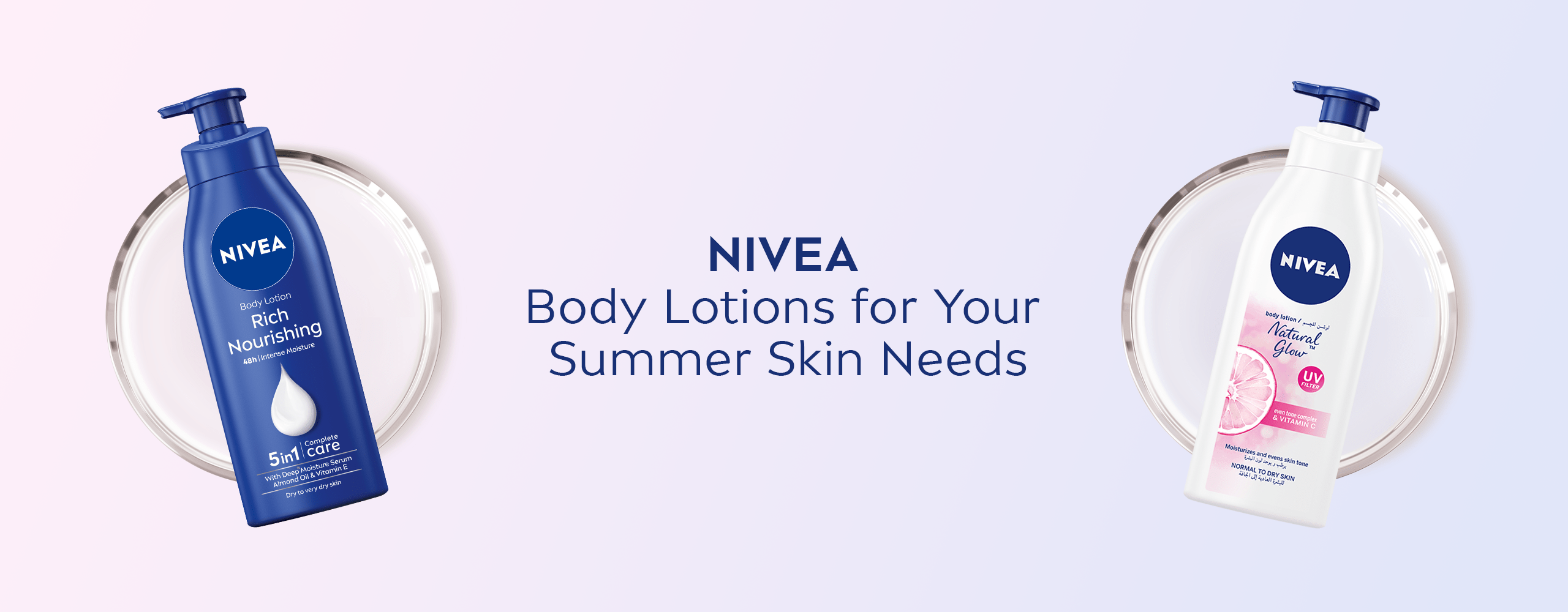 Want moisturized, radiant, and even-toned skin? Discover the only two body lotions that your skin wants, especially during the summer! With 2x the moisturizing ingredients vs. ordinary body, lotions*, NIVEA 5in1 Rich Nourishing Body Lotion keeps your skin moisturized for up to 48 hours and protected from dryness and dehydration. While NIVEA Natural Glow Body Lotion boosts your skin’s natural radiance, protects it from sun exposure and gives you healthy even toned skin.