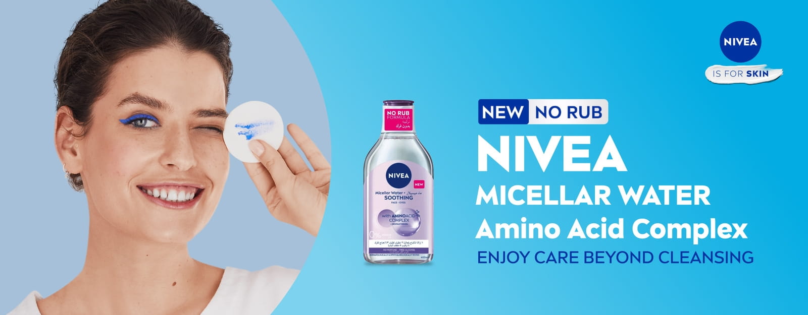 The NIVEA Micellar water with amino acid complex removes heavy makeup with no rubbing and leaving 0% residue, all while hydrating, soothing, and letting your skin breathe
